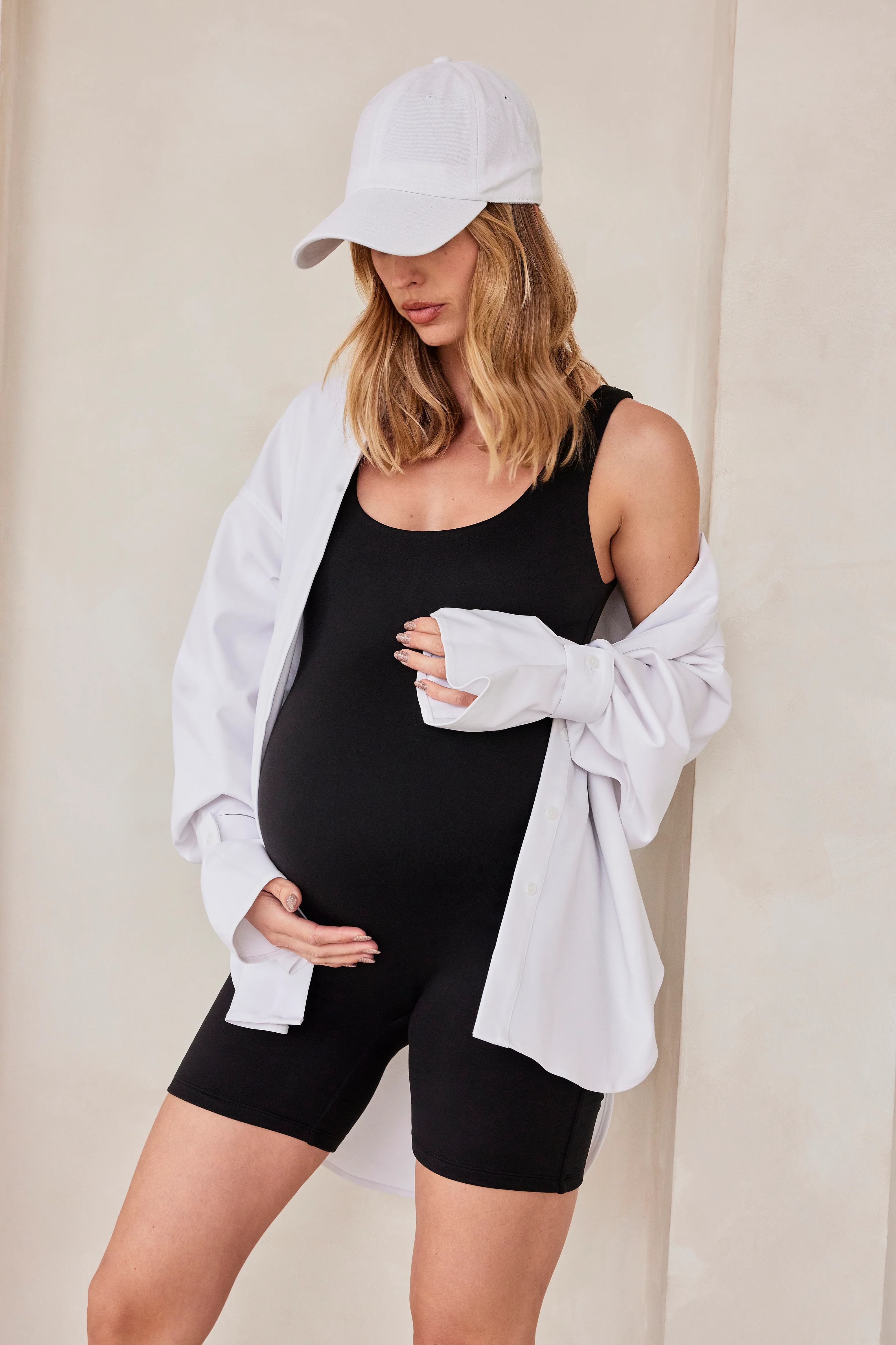 The Cotton Romper is made to gently stretch with the body through the stages of pregnancy. We recommend ordering Bumpsuits in your regular size.